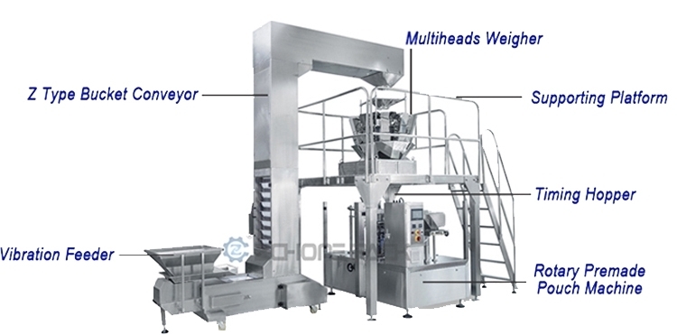 | Work flow | Giving bag→Coding→Opening bag(or Open zipper bag)→Filling→ Auxiliary→Exhaust→Heat sealing→Forming and output products. | ||
