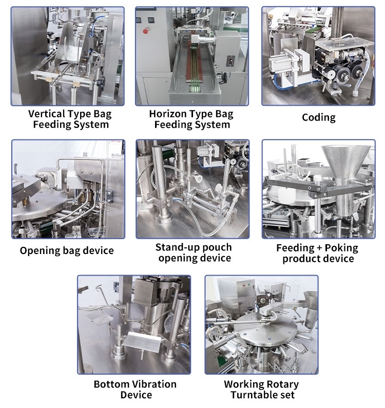 | Work flow | Giving bag→Coding→Opening bag(or Open zipper bag)→Filling→ Auxiliary→Exhaust→Heat sealing→Forming and output products. | ||